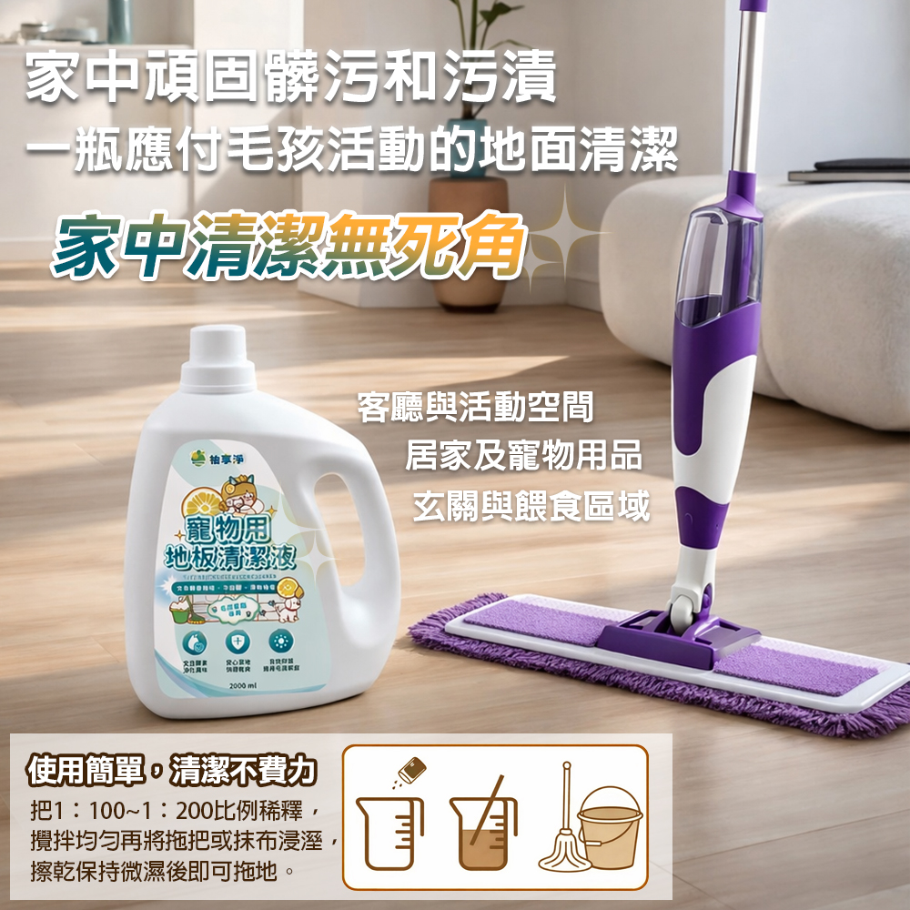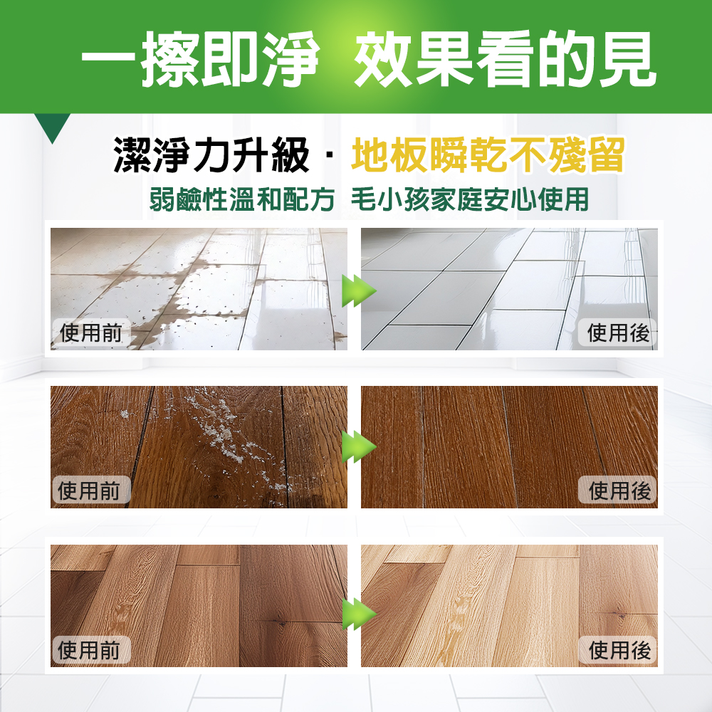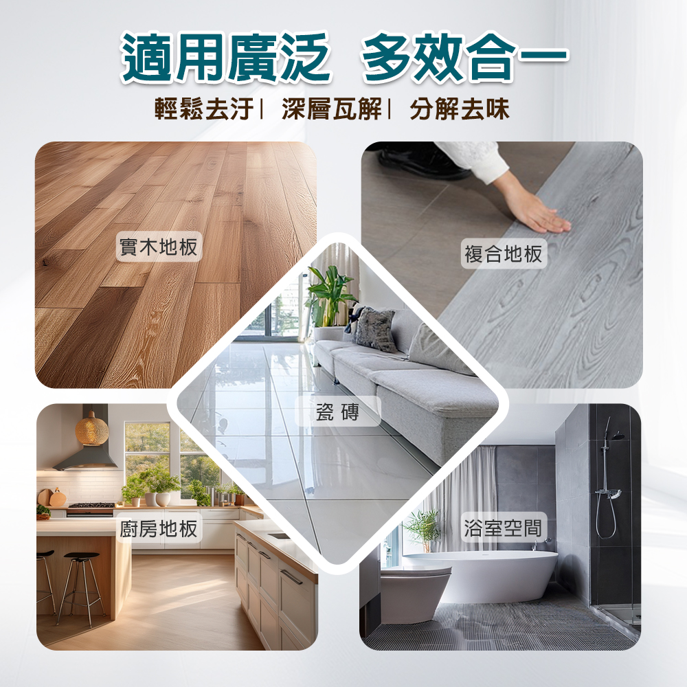 為家打造安心純淨的地板 溫和潔淨配方:弱鹼性配方溫和不傷材質,適用磁磚、木地板、大理石、磨石子等多種地板,讓全家使用更安心 文旦酵素淨味去污:以一年期雙階段發酵文旦酵素,有效分解髒汙並減少地板異味,保持空間清新。 速乾不黏膩:清潔後快速乾爽、不留水痕,家人與毛孩走動 也不會黏腳。